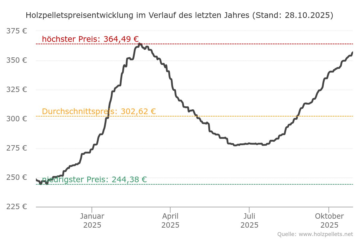 Derzeit kostet eine Tonne lose gelieferter Holzpellets im Silowagen bundesweit durchschnittlich rund 356 Euro. In Österreich liegt der Preis mittlerweile bei etwas über 340 Euro pro Tonne. Sackware kostet in Deutschland bei einer Abnahme von zwei Paletten etwa 400 Euro pro Tonne.