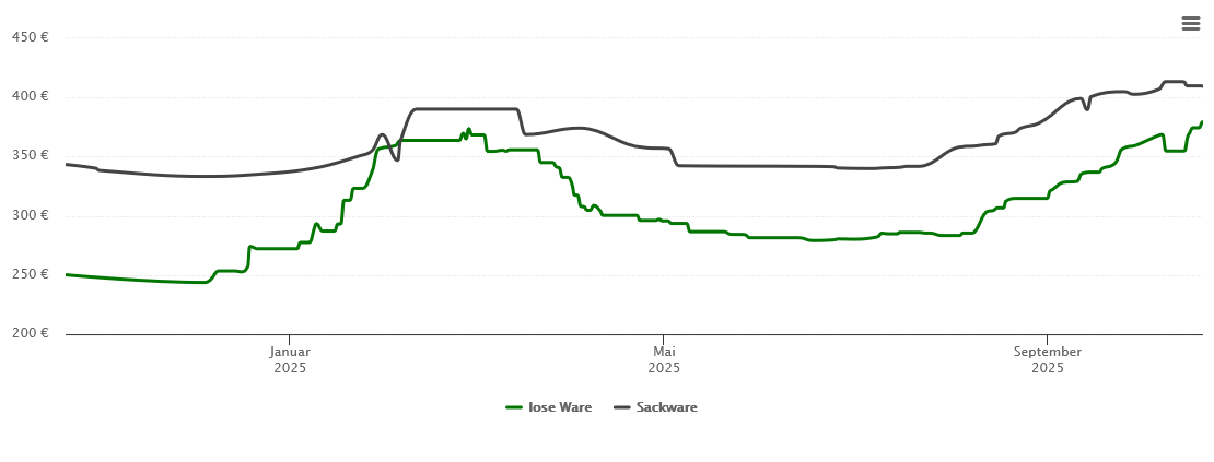 Die Tabellen zeigen die Höchst- und Tiefststände der Pelletspreise für lose Holzpellets und Holzpellets Sackware in Neustetten. Das dazugehörige Datum zeigt, wann der Höchst- oder Tiefststand im jeweiligen Zeitraum erreicht wurde.