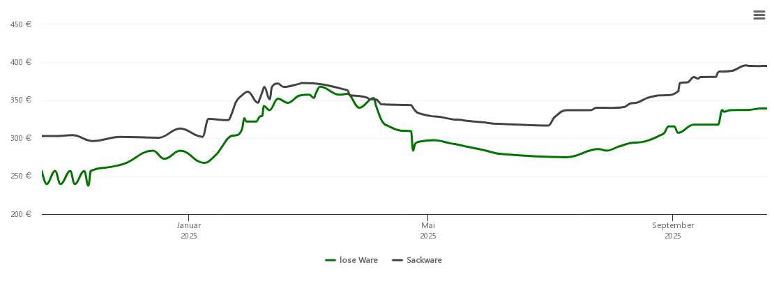 Die Tabellen zeigen die Höchst- und Tiefststände der Pelletspreise für lose Holzpellets und Holzpellets Sackware in Brachttal. Das dazugehörige Datum zeigt, wann der Höchst- oder Tiefststand im jeweiligen Zeitraum erreicht wurde.