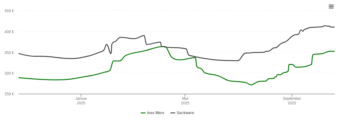 Die Tabellen zeigen die Höchst- und Tiefststände der Pelletspreise für lose Holzpellets und Holzpellets Sackware in Kenn. Das dazugehörige Datum zeigt, wann der Höchst- oder Tiefststand im jeweiligen Zeitraum erreicht wurde.