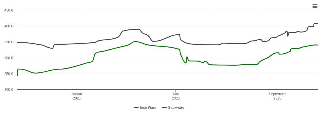 Die Tabellen zeigen die Höchst- und Tiefststände der Pelletspreise für lose Holzpellets und Holzpellets Sackware in Landsberg. Das dazugehörige Datum zeigt, wann der Höchst- oder Tiefststand im jeweiligen Zeitraum erreicht wurde.