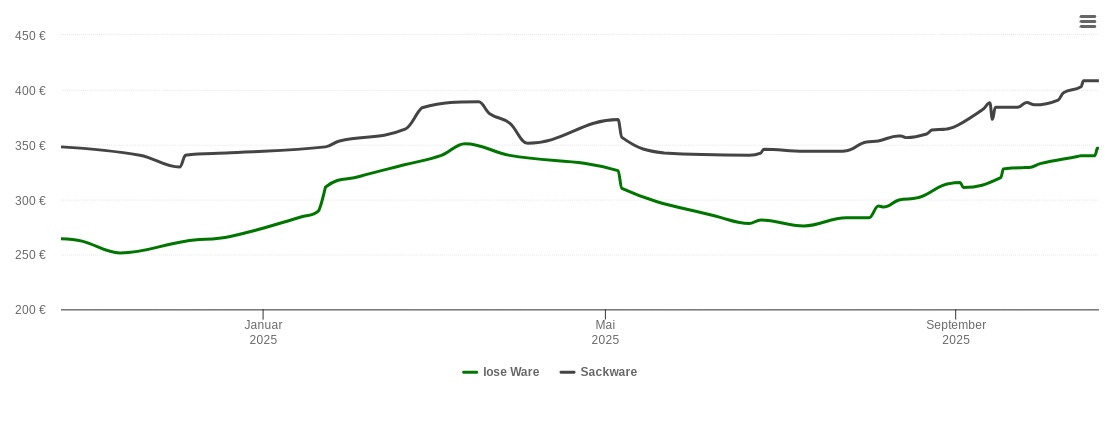 Die Tabellen zeigen die Höchst- und Tiefststände der Pelletspreise für lose Holzpellets und Holzpellets Sackware in Hohenstein-Ernstthal. Das dazugehörige Datum zeigt, wann der Höchst- oder Tiefststand im jeweiligen Zeitraum erreicht wurde.