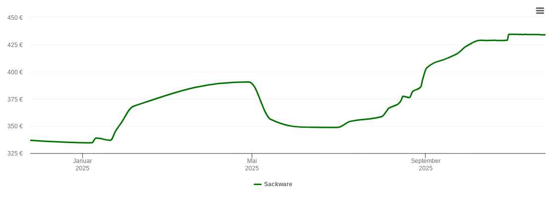 Die Tabelle zeigt die Höchst- und Tiefststände der Pelletspreise für Holzpellets Sackware. Das dazugehörige Datum zeigt, wann der Höchst- oder Tiefststand im jeweiligen Zeitraum erreicht wurde.